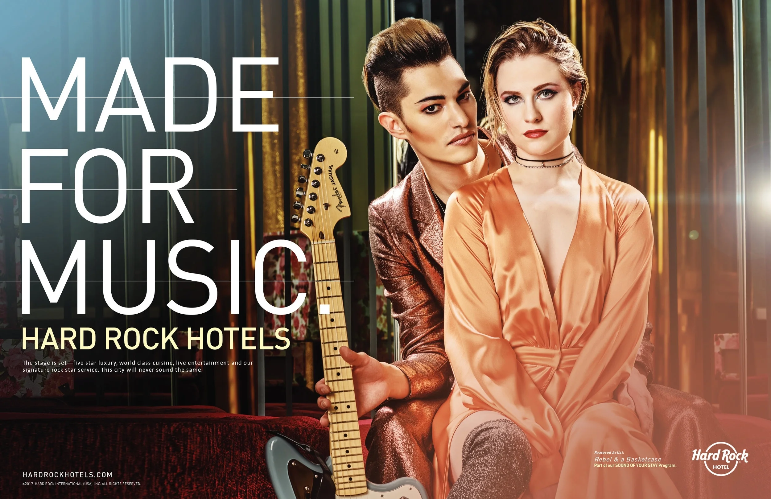 Hard Rock Hotel & Casino's current Brand Campaign—Made for Music—features the company's Artist Ambassadors in their proprietary music amenity program, The Sound of Your Stay. The brand partnered with several emerging and award-winning musicians, Rebel & a Basketcase, New Politics, Run River North, Michelle Branch and The Aces. The Made for Music campaign was developed in collaboration with the very talented Tom Macaluso and Robert Merrick from Anson-Stoner, and the photographic genius of John Deeb. The video of Artist Interviews was developed for the guest room channel, website and social media.